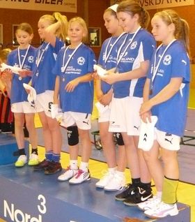 Pigerne får overrakt deres bronzemedalje samt et par sokker.