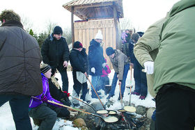 55 beboere bagte pandekager og drak eftermiddagskaffen på Fortepladsen i Volsted.