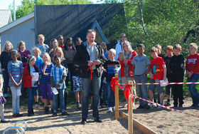 Formanden for støtteforeningen til Lyngbjerggårdskolen, Martin Jensen, klar til at klippe snoren til den nye legeplads.