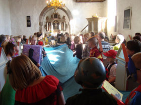 spændt ventede på hvad der skulle ske. Lene skulle have hjælp af alle børnene til at lave stormvejr på havet, det foregik i midtergangen af kirken, og der kom virkelig gang i vandet. Bagefter sang børnekoret et par sange og så gik turen ellers i forsamlingshuset til tøndeslagning.