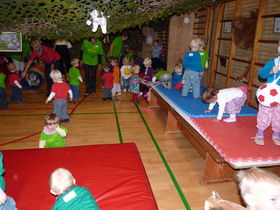 I Støvringhallen blev der om formiddagen hygget med boldspil, Tarzan-bane (forhindringsbane) og sange fra dagplejens egen fagtesangbog.