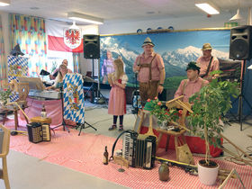 Festen kunne gå igang, og ind på den flot pyntede scene kom gruppen Tyrolerklang fra Viborg bestående af operasanger Anders Hald, organist Henriette Hald, deres 9-årige datter Leonore og tre andre musikere - alle klædt i ægte tyrolertøj med lederhosen, dirndl (tyrolerkjole), hatte osv.