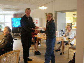 John Lomholt Årestrup overrækker brugerrådsformand Gulle Sørensen checken, mens beboerne interesseret kigger med.