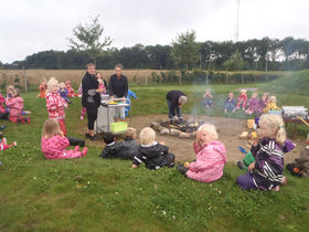 Karsten Hansen kom og pressede æbler sammen med os. Bedsteforældre og forældre havde taget en masse æbler med, så der blev presset æbler til den store guldmedalje – der blev både til smagsprøver og børnene kunne få en lille flaske med hjem. Der var forskellige andre aktiviteter på dagen – blev bagt pandekager over bålet, en af grupperne underholdt med en bevægelsessang, der blev spillet fodbold m.v.