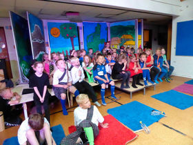 Klasserne havde arbejdet intenst i to uger med at lære replikker, sange og lave kulisser og det var derfor en stor oplevelse endelig at kunne vise Rakethelikopteren for først 0. og 1. årgang om formiddagen og dernæst forældre og søskende om eftermiddagen.