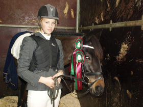 Her ses Sofie Hald og hendes pony Tovdal´s Ace Of Diamonds med deres velfortjente rosetter.