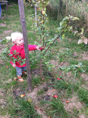 Forleden dag ville børnene igen ud og plukke æbler, men skolebørnene, der også havde opdaget de dejlige æbler og spist årets sidste på træet, kom først. De små I vuggestuen stod og pegede op og sagde “Ikke fler’ æbler?”. En hurtig pædagog i vuggestuen skyndte sig at ringe til svigerfar, der straks kom med en pose æbler gemt i kælderen fra egen have. Æblerne blev hængt op med tape på vuggestuens træ under luren. Efter eftermiddagsluren, var der igen æbler på træerne, og også de mindste børn fik en oplevelse af at afslutte æblesæsonen med endnu et saftigt æble de selv havde “plukket”.