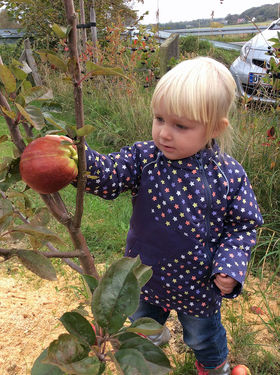Vuggestuens børn plukkede derefter flere æbler fra Guldklumpens sansehave, der har egne æbletræer. Derpå vaskede de dem, udkernede dem og skar dem ud i stykker. Smagen af friske æbler, man selv har plukket, er det bedste i verden, og i vuggestuen gik den dag med en god snak om årstider og farver.