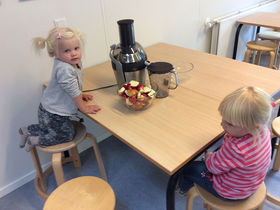 Til formiddagsmad har børnene været med til at rive æbler til deres yoghurt og putte det deri. De har presset saft i juicemaskinen og smagte saften fra æblerne. Kødet fra æblerne bagte de små æblepandekager med til frokost.