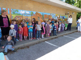 Først var der fernisering på børnehavens nye store og flotte vægmaleri på muren ud mod børnehavens parkeringsplads udført af Ib Gustavsen, tegner og grafiker fra Arden. Ib Gustavsen har tegnet situationer fra børnehaven og fra børnenes hverdag, og der er masser at kigge på, det imponerende og farvestrålende værk. I forbindelse med ferniseringen sang de mange glade børn tre sange for publikum og de dygtige børn klarede det super flot.