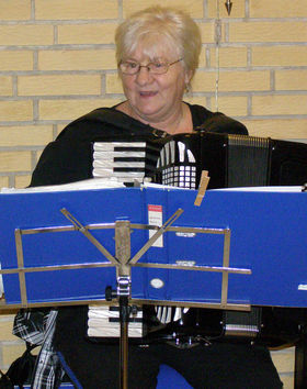 Bente Gade, der er frivillig hjælper på Birkehøj, havde taget sin harmonika med og underholdt selskabet med musik og sang, som til fulde understøttede hyggen og snakken rundt om bordet.