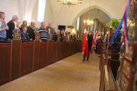 Lokale spejdere bar Dannebrog og Union Jack ind i kirken til tonerne af Prins Jørgens March.