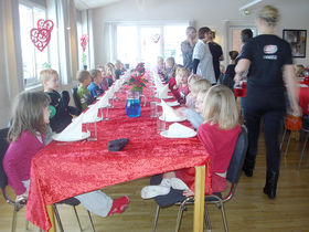 Menuen stod på bl.a. på fiskefilet, frikadeller, kyllingelår – og i rigelige mængder – og dertil lækkert tilbehør. Frokosten blev afsluttet med dejlig ris-a-la-mande med kirsebærsauce. I dagens anledning blev den gode mad skyllet ned med saftevand i alverdens spændende farver. Det var noget, der gjorde lykke hos børnene.