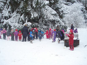 Det var en flok spændte og ivrige børn, der startede dagen med at spise formiddagsmad i børnehaven og derefter iførte sig varme flyverdragter, huer, vanter og støvler. Herefter gik alle ud til skoven ved Hermesparken, hvor der blev leget i den næsten uberørte sne. Der var et kæmpestort grantræ – nærmest et juletræ uden pynt – som man forsøgte at lave en rundkreds om. Og jo, det lykkedes. Man var lige netop nok til at nå omkring, når man strakte armene langt, langt, laaaaangt ud.
