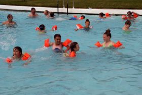 Afslutningen på fælleslejren foregik i friluftsbadet i Aars. Børnehjemsbørnene nød svømmebadet i fulde drag i det varme sommervejr.