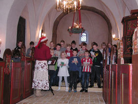Efter en hurtig kop kaffe, gik man alle ned til kirken, hvor de kommende konfirmander sammen med børnekoret stod for gudstjenesten. Med læsninger fra bibelen, skuespil og sang blev juleevangeliet vist. Sammen med tre af julens salmer var det en meget stemningsfuld gudstjeneste