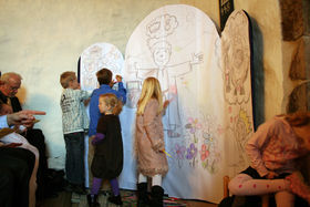 Alle børn i kirken malede på en altertavle med billeder af historien om Josef.