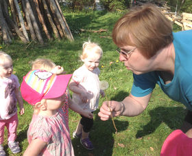 Op ad dagen blev der pustet med sæbebobler, spillet med bolde, leget i huler og gået på line. Her hjalp de større børn de mindre med at holde balancen og forklare, hvordan man skulle gøre. Et sammenværd, der skal opleves. Den pragtfulde location gjorde det muligt at udforske naturen, der blev plukket blomster, pustet mælkebøtter, og stillet mange undrende spørgsmål.