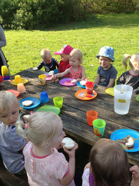 - Disse linjer blev starten på dagen for 10 af Rebilds kommunale dagplejere, Lotte, Linda, Anita, Gitte, Lene, Rikke, Bettina, Heli, Karin, Josefine, og deres i alt 45 børn, som onsdag den 11. maj kunne fejre den traditionelle dagplejedag i FDF-huset i Støvring.