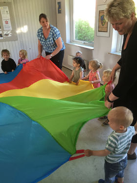 STØVRING: Der var sang, dans og dejlige grin mens børnene legede med faldskærm inde i FDF-huset. Da temperaturen lundes uden for, og duggen var forsvundet fra græsset var der tid til formiddagsmad.