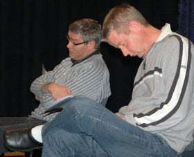 STØVRING: Selv om titlen på dette års revy indikerer at Stubhusrevyen ikke sparer på energien kan der under gennemgangen af de forskellige numre godt blive lidt ventetid på scenen, og som det kan ses på billedet fremfører Peder Hjørne og Leif Bach hurtig en lille optræden som to ældre herrer, der er blevet lidt trætte af at vente til stor morskab for hele holdet.