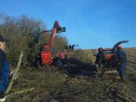 Om formiddagen mødte der 16 frivillige hjælpere op, og efter en kort briefing, gik alle mand i gang. Der er heldigvis stor opbakning fra Suldrups erhvervsdrivende, til sådanne initiativer, og vi havde derfor professionelt grej til rådighed, så som læbælteskære, rendegraver og flishugger, hvilket effektiviserede arbejdet en del.