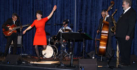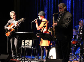 Musikken og musikerne var jo den egentlig baggrund for, at aftenens stemning fløj helt op under loftet. Her var Jens Kristian Kwellas dybe bløde jazzguitar én af årsagerne, der sammen med Finn Odderskovs flotte saxofonspil, lagde en dybde bag sangerinden Karoline Budtz, men uden rytmegruppe ingen sound. Her var Peter Lund-Paulsen fantastisk på trommer, tredje gang i træk på scenen i ”Jazzhuset” og sammen med Jesper Carlsen på sin levende bas.