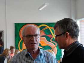 Flemming Christensen, der har doneret billedet, overværede også afsløringen af det nye kunstværk på Ravnkilde Skole (Her i samtale med viceskoleleder Jørn Lund).