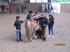 Søndag formiddag blev der trænet til opvisning. Man havde mange ting man gerne ville vise forældrene. Opvisningen startede med kvadrilleridning på dressurbanen med Dorthe, Laura J., Anne, Nanna, Belinda, Sara, Laura K. og Christian. Så viste Iben D., Laura D., Christine og Ninna, hvordan man i det små begynder at springe bane på springbanen. Derefter kom der et indslag med Sofie, Karoline, Mathilde C., Katrine S. og Sophia, der viste hvad man ofte laver i en ridetime med at skifte gangarter, volte, stoppe, starte, galop med og uden trækker, trav over bomme og Karoline sprang et lille spring til sidst. Så viste Natalie, Mette og
