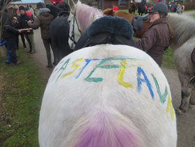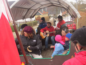 Aarestrup - landsbyen midt i Himmerland - har det hele - fastelavnsridt om formiddagen og gudstjeneste og tøndeslagning om eftermiddagen.