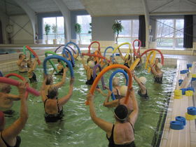 Her er man i fuld gang i vandgymnastikken med aqua-slanger i det 34 grader varme vand.