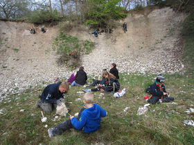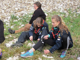 Spejderne fordelte sig rundt om i kalkbruddet, og snart var der godt gang i hammer og mejsel. Efter at have hakket lidt kom også de første resultater frem af kalken – nogle meget fine forsteninger af søliljestilke blev betragtet med stor interesse.