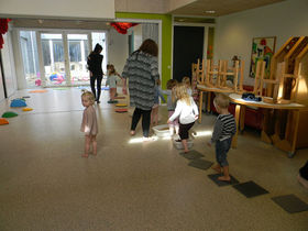 Til slut lavede man en agilitybane i alrummet. Man gik med bare tæer og mærkede, hvordan forskellige overflader føltes på fødderne. Der var stenmåtter, legoplader, balancebom, bløde og hårde tæpper, koldt og varmt vand, korn, sand, grankogler og mange andre ting.