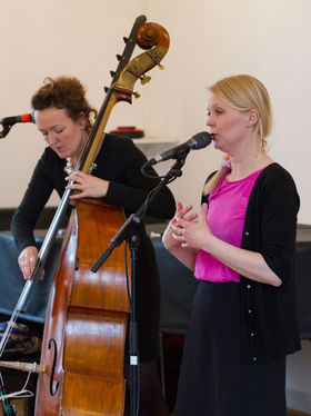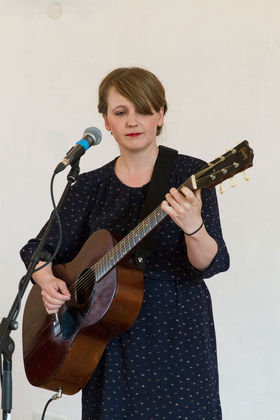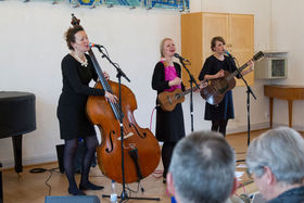 ”Huset” var også næsten fyldt, da Sara Grabow og veninderne slog de første toner an. De tre veninder, der skulle på scenen denne eftermiddag, var: Sara Grabow, vokal, ukulele og melodica. Eva Skipper, vokal og kontrabas og Martine Madsen, vokal og akustisk guitar.