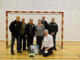 På billedet ses: Jørn Otte, formand i IK Frem Sønderup/Suldrup, Per Nedergaard, formand for petangue-afdelingen, førstehjælpsinstruktør Lisbeth Stenstrup Jensen, Røde Kors, formand Gerda Pinstrup, Røde Kors, Rebild Afdeling, indsamlingsleder ved Røde Kors Indsamling i Suldrup, Arne Bjørn, elinstallatør Leif Aamann samt aktivitetsleder og førstehjælpsinstruktør Olau Holtvind, Røde Kors.