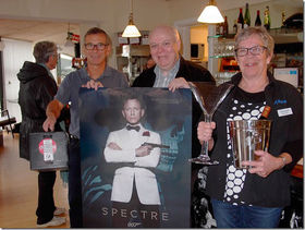 Seniorbiografen er klar til at vise sit publikum den nye James Bond-film torsdag formiddag. Filmen ligger i den boks, som Kinorevuens kasserer Niels Madsen holder i sin højre hånd. I midten står direktør Flemming Jensen med plakaten, og til højre ses cafedame Jytte Holm, med champagnen, som hører med til en James Bond-film.