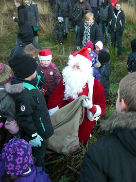 65 børnehavebørn, søskende og forældre var ude og gå en tur i skoven sammen med julemanden, for at finde hans sæk med julegodter.