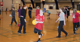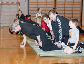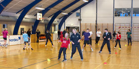 Invitationen var delt ud til alle trænere, spillere og forældre i primært fodbold og håndbold afdelingen. Og sikke et tilløbsstykke. Hallen var fyldt med næsten 60 deltagere, som afprøvede en lang række øvelser under kyndig vejledning af Trine Bødker fra Nørager Fysioterapi. Programmet, der blev taget udgangspunkt i, er et 20 minutters program udviklet i Norge, som der er evidens for, at det virker.