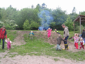 legepladsen, og der blev cyklet, klatret og gynget. Børnene havde ligeledes mulighed for at kæle med kaninerne, og der blev spist boller, som var bagt på bålet.