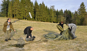 Modstandsfolk i gang med at pakke faldskærm sammen, der har båret en våbencontainer. Fra optagelserne til filmen ”I krigens skygge”.