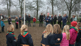 Godt 35 spejdere var samlet ved Spejdergården på Hjedsbækvej, da flaget blev hejst under fællessang.