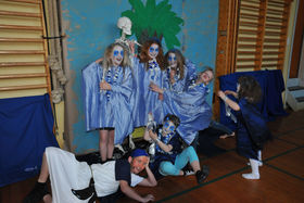 Samtidig har eleverne også været med til at designe og sy alle kostumer, samt udforme og dekorere de 3 scener, som musicalen udspiller sig på. Især den flotte og fyldige sminkning af skuespillerne skal nok give nogle forældre, lidt ekstra opgaver de næste par dage. Touperet hår og en del blå hårspray pynter mange af de medvirkende.