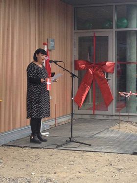 Biblioteksleder Lone Skov holdt en velkomsttale ved indvielsen af det nye bibliotek.