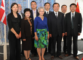 Borgmester Anny Winther, kommunaldirektør Erik Odder og de seks besøgende fra Jiaxing, havde god gavn af professor Li Xing (Aalborg Universitet), der fungerede som tolk.