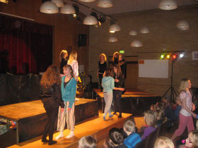 I sidste uge var hele musicalvalgholdet samlet i skolens festsal, hvor de uafbrudt arbejdede med at få de sidste detaljer på plads, så de kunne lave generalprøve torsdag aften for forældre, søskende og bedsteforældre. Normalt siges det, at en dårlig generalprøve er et godt tegn for den virkelig forestilling. Men generalprøven gik rigtig godt, så det var nogle nervøse skuespillere, der mødte op fredag, hvor der var forestilling for klasserne på skolen. Dette var dog ubegrundet, da alle optrådte med masser af energi og indlevelse og som afslutning på en hektisk uge modtog de mange rosende ord og kæmpe bifald.