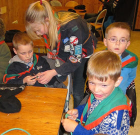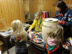 Aftenens undervisning blev således en blanding af at male fastelavnstønder, og af at lære knob og stik hos Juniorerne.