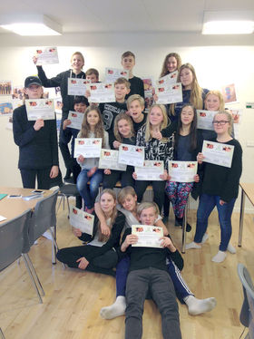 Glade elever fra 7.b på Karensmindeskolen med deres diplomer for et velgennemført MILIFE-forløb.