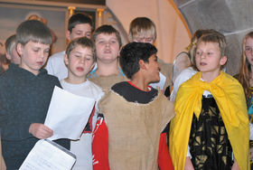 Efter Luciaoptoget var det femte og sjette klasses tur, de opførte krybbespil på en meget flot og gennemført måde, med en oplæser og skuespillere, der mimede det sagte. De havde derudover, valgt at synge tre salmer som både blev sunget én- og tostemmigt. Præsten sluttede aftenen af i kirken med, at give hendes version krybbespillet, hvilken jo var meget lærerigt. Herfra gik turen til sognegården, hvor der var æbleskiver og gløgg.