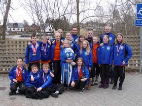 Stævnet startede med opvarmning kl. 9.00 søndag morgen, og da klokken var blevet 17.30 inden stævnets afslutning, var det lidt svært at få styr på alle svømmerne. Med på billedet ses også holdets mascot ”Smuttie”, som er en fast deltager ved stævnerne. Imellem stævnerne er ”Smuttie” på skift hjemme hos svømmerne.