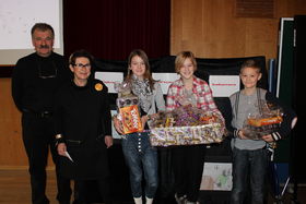 Britta Madsen og Søren Gøttrup ses her sammen med de tre vindere af tegnekonkurrence, Mathilde Sadolin, Cecillia Frisk og Mark Bisgaard.